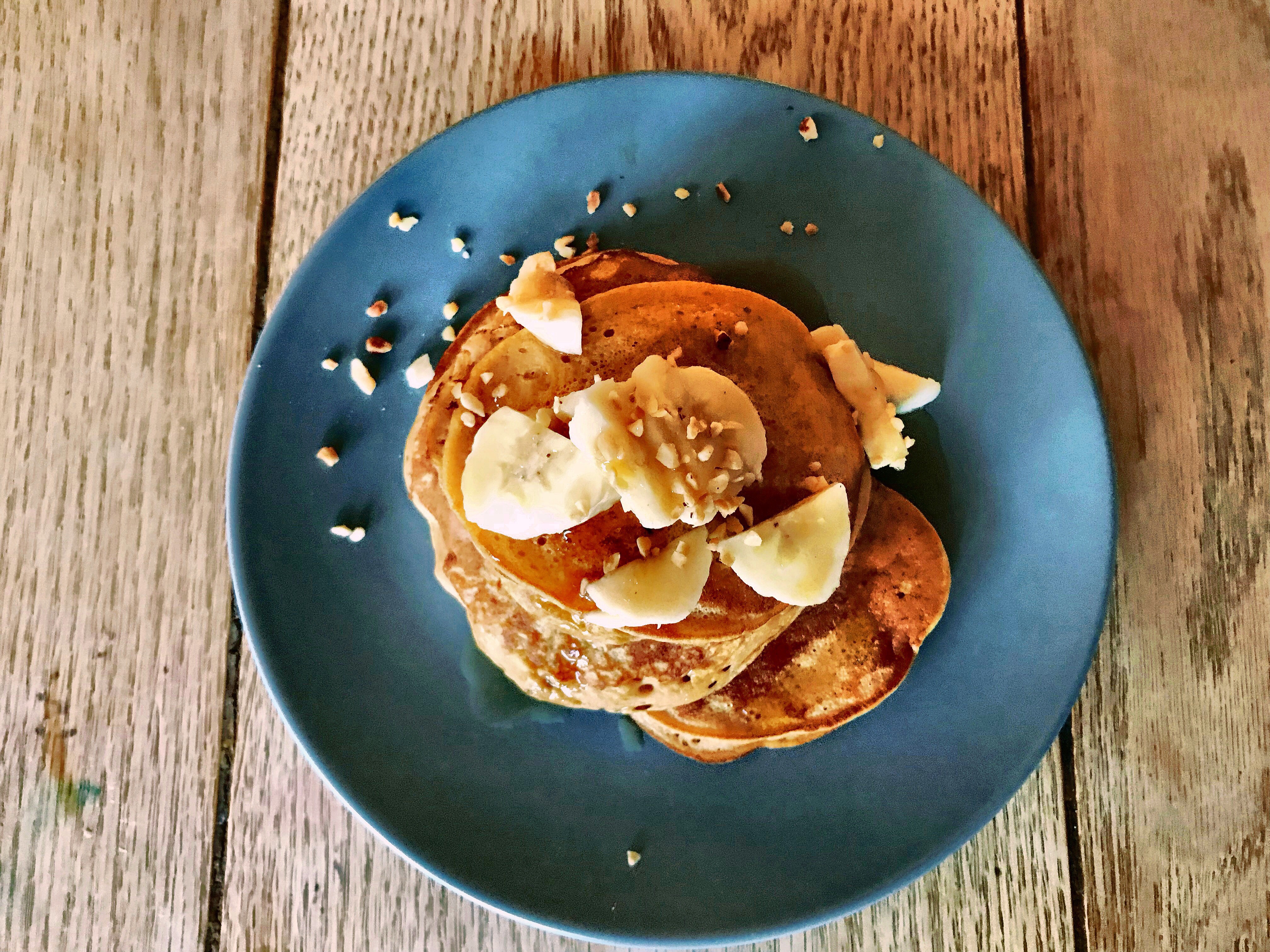 These are made with sweet potato and banana. My first try was flour free – and an utter failure, they definitely need flour of some kind. But what kind is up to you – wholemeal or coconut is a great choice for added health benefits. I love swopping in vanilla protein powder for an extra tasty high protein pancake – but wouldn’t go with this for kids.