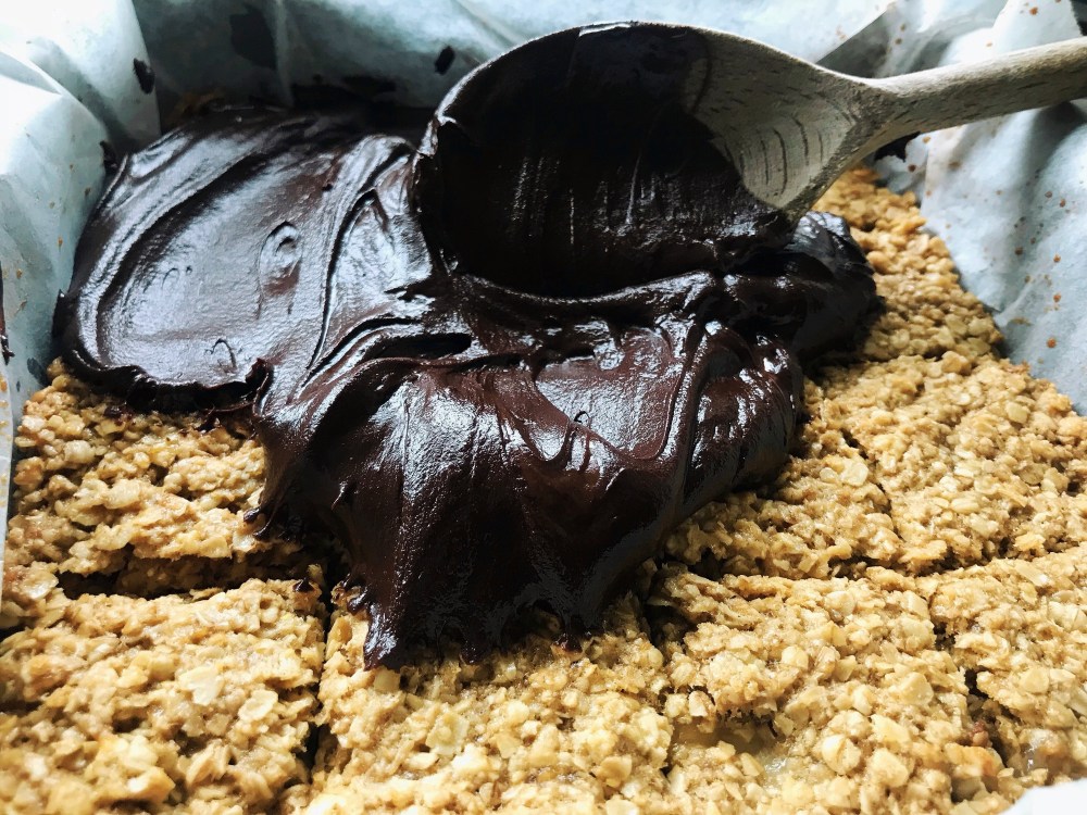 I’m pretty sure my desert island essentials would be oats, bananas and chocolate – I could happily survive on this combo for years with no complaints. I’m therefore always looking for ways to combine them, and have been experimenting with recipes for aeons in a quest for the perfect chocolate banana flapjack . I know there is an ongoing debate over whether a flapjack should be crunchy or soft and chewy – I’m most definitely on the soft and chewy side, and have finally, after much trial and error, have worked out the key – a lower oven temperature when baking. These can be made with pretty much whatever is in your fridge and cupboard – they can be refined sugar, gluten and dairy free if that’s your bag, or buttery and sugary if you’re more of a traditionalist. If you’re on a health kick you can forget about the topping altogether – they are delicious unadorned as well.