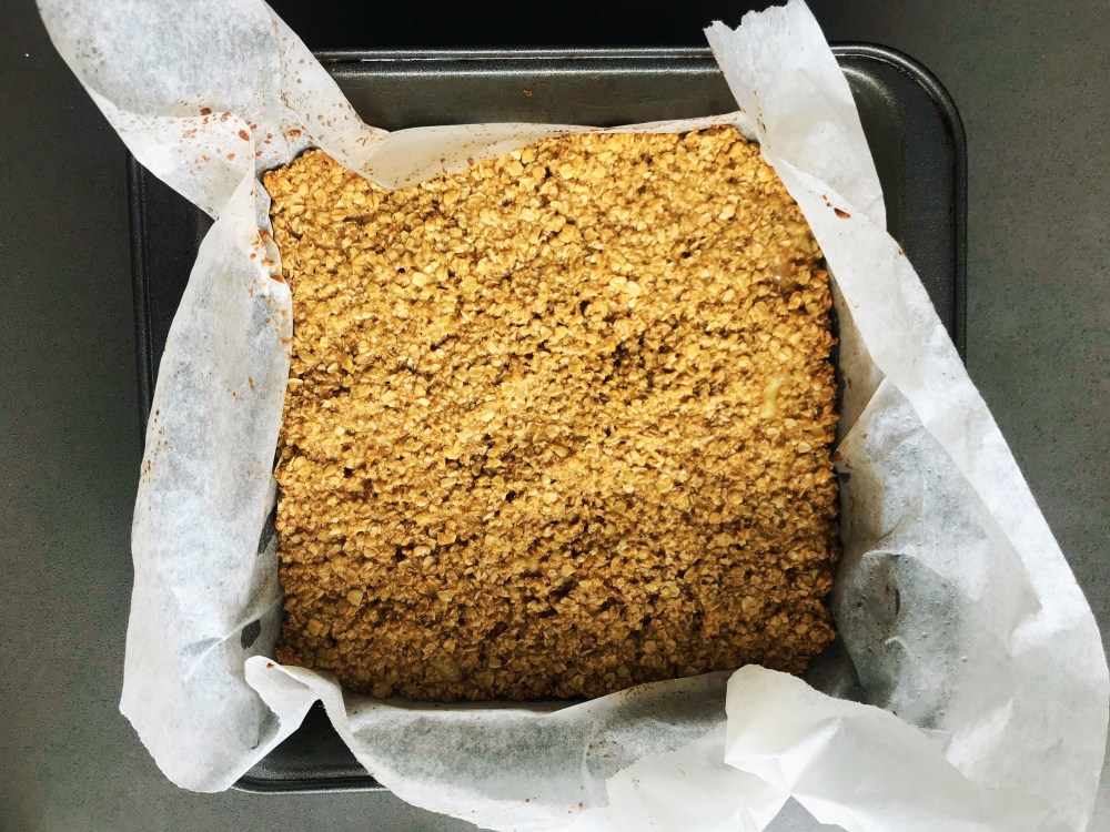 Pour the mixture into the baking tin and smooth over the top with the back of a spoon. Bake in the oven for 20 minutes until just turning a little golden around the edges. Leave to cool in the tin then place in the fridge to chill a little.