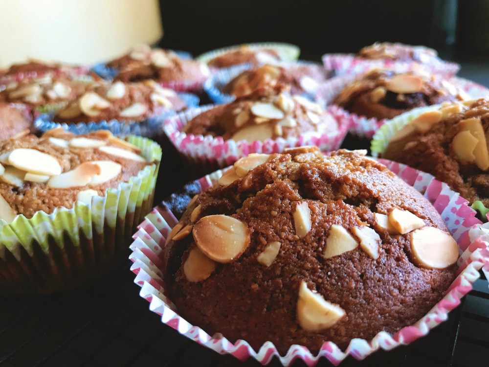 Preheat the oven to 180 and put 12 muffin cases into a muffin tray. Put the eggs, oil and milk into a large bowl and mix well. Add the rest of the ingredients except the raspberries and flaked almonds and stir well to remove any lumps, but don’t over mix. Fold in the raspberries, then divide the batter between the muffin cases. Sprinkle a few flaked almonds onto each one, and then bake in the oven for 20-25 minutes until golden brown on top and a skewer comes out clean.