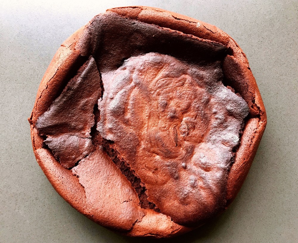 Remove from the oven and allow to cool in the tin- it will sink in the middle and crack round the edges but this is part of the process so don’t panic!