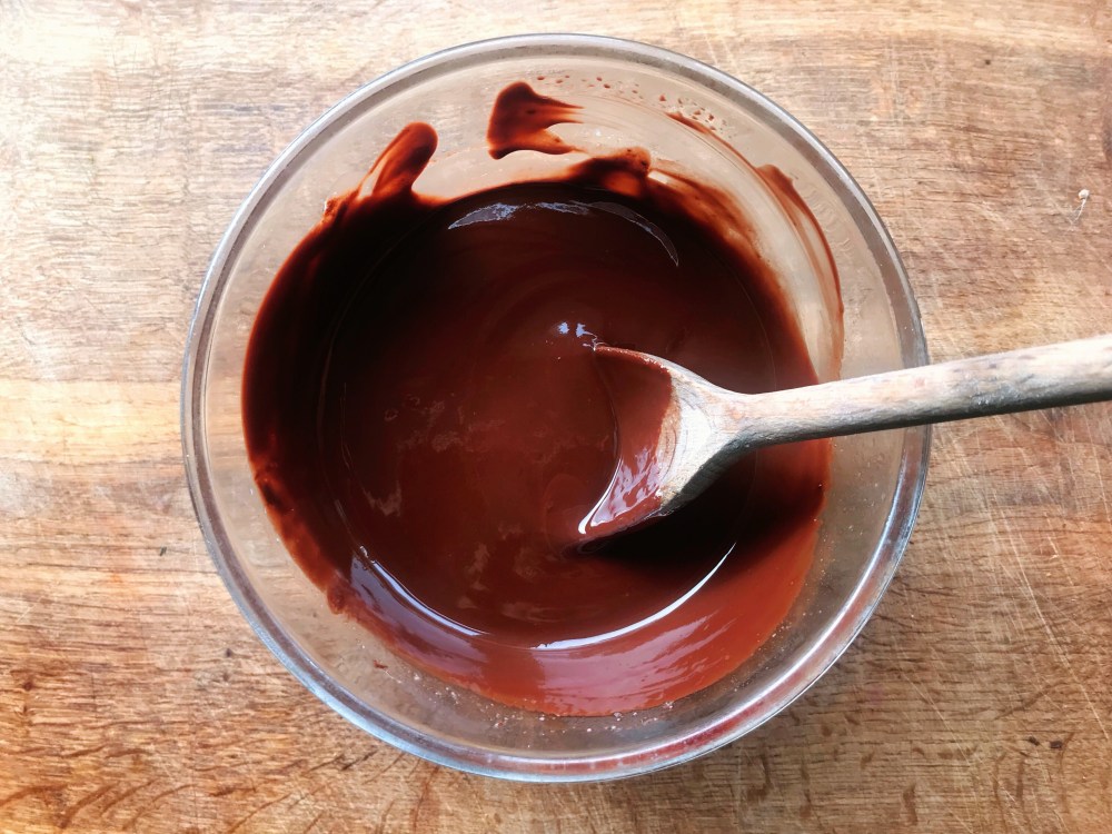 Put the butter and chocolate into a heat proof bowl and gently melt together on a low heat in the microwave, or over a pan of boiling water, stirring regularly.