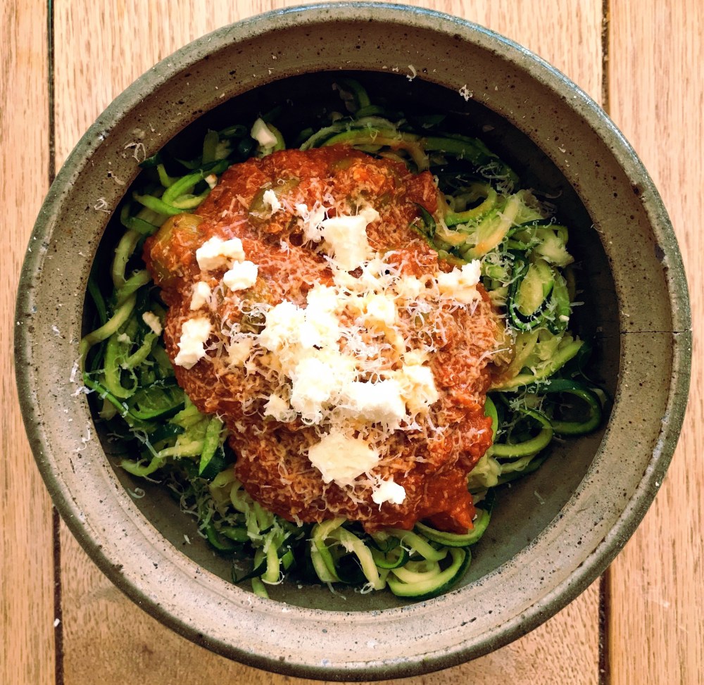 Drain any more liquid from the courgetti then dish into a bowl, stir through the sauce and top with feta and grated Parmesan.