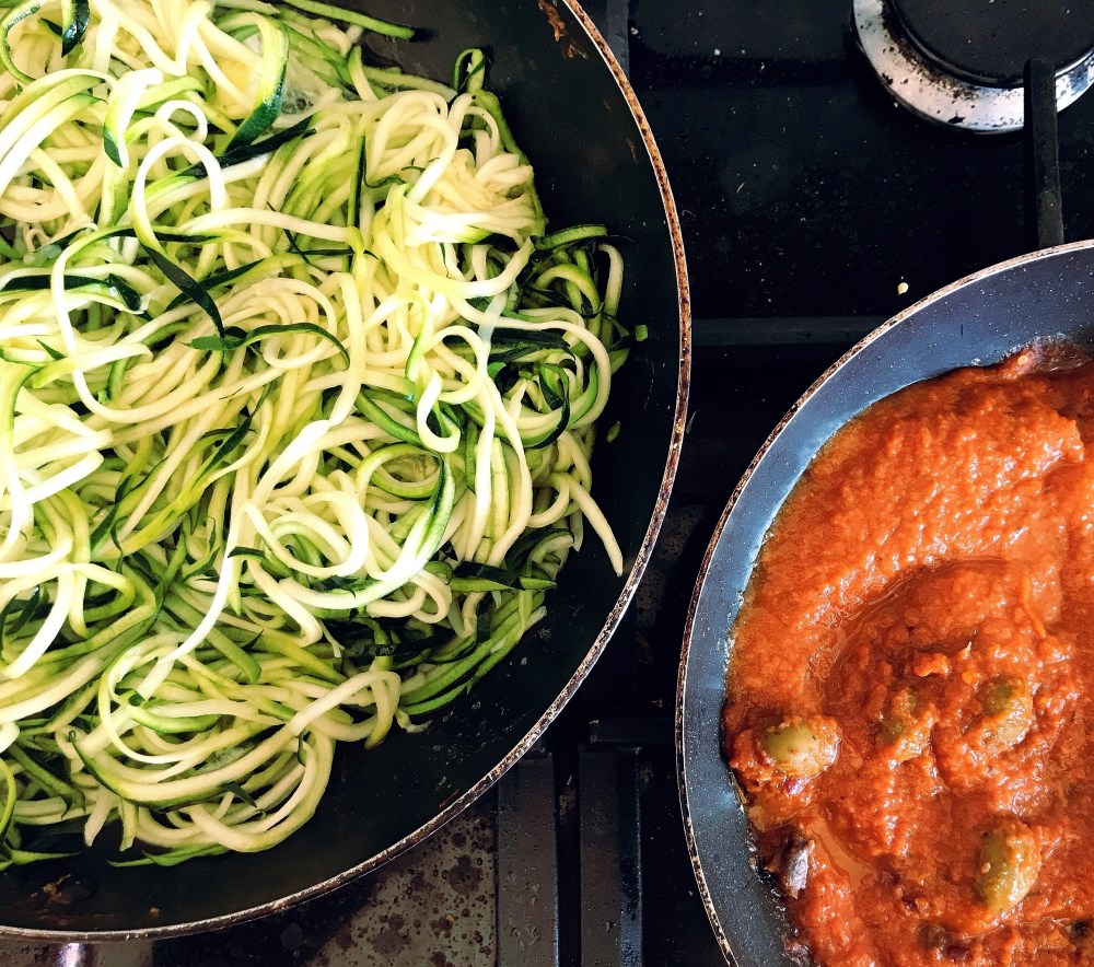 This has become an absolute staple meal in my household recently. I generally try to make a big batch of my Eat on Everything Tomato Sauce at the weekend, and use it on pasta, pizza and all sorts during the week – and this simple meal is my new favourite. It’s along the lines of a spaghetti alla puttanesca – which translates as “spaghetti in the style of a whore” – hence the title. I like to use courgetti for a low-carb, meal which is filling, nourishing, healthy – and unbelievably tasty. But feel free to use spaghetti instead – just cook the spaghetti as you ordinarily would and then stir through the sauce. For a real time-saver you could use a good quality shop-bought tomato sauce – I like Mr Organic Healthier Choice which contains no added sugar or preservatives.