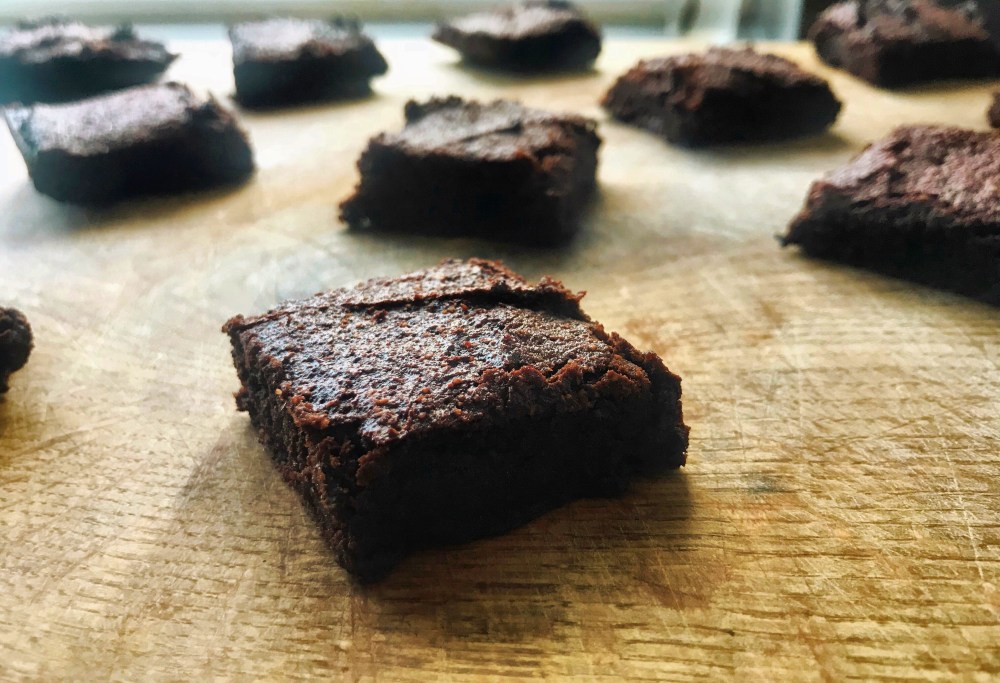 Having said that, if you’re looking for a healthier or vegan treat – these resemble a decent brownie in all but the ingredients- they are sweet and chocolately, with a dense fudgy centre and crisp top. They are free from refined sugar, dairy, eggs and gluten, but still very delicious. This recipe makes 16 small brownies, as they are quite rich and just a small square feels like plenty.