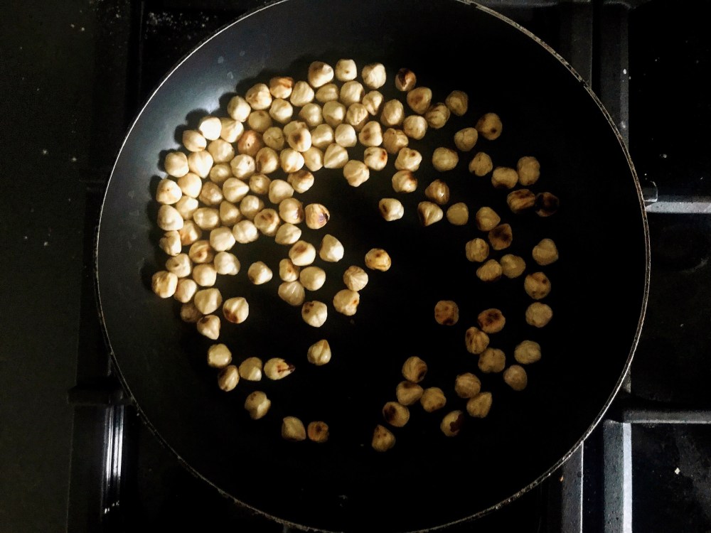 Heat a dry frying pan and gently toast the hazelnuts for a few minutes, shaking often until golden. Put them into a food processor and pulse into tiny pieces.