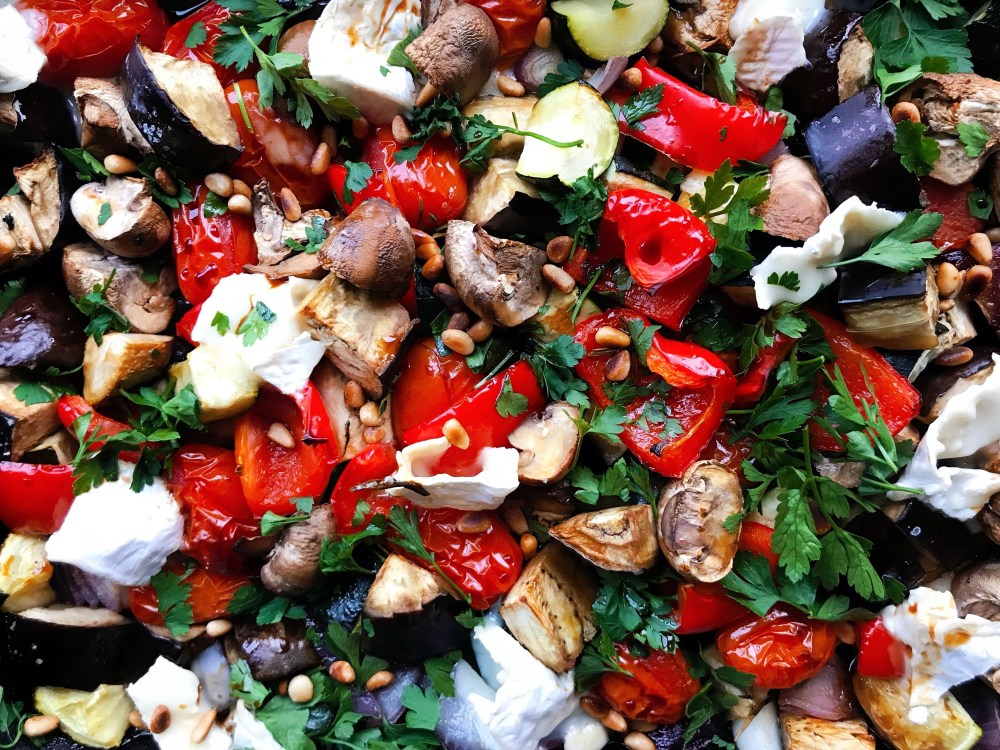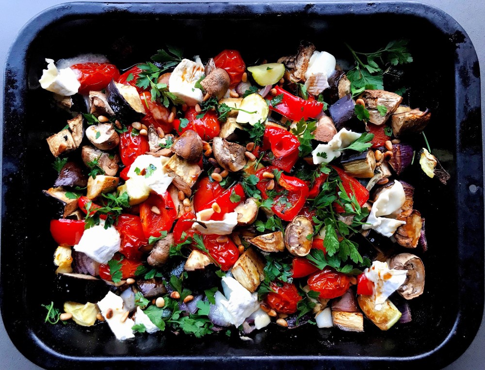 A couple of minutes before the cooking time is up, scatter the goats cheese into the roasted veggies, and return to the oven.