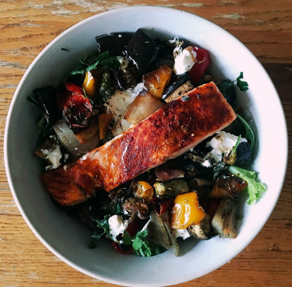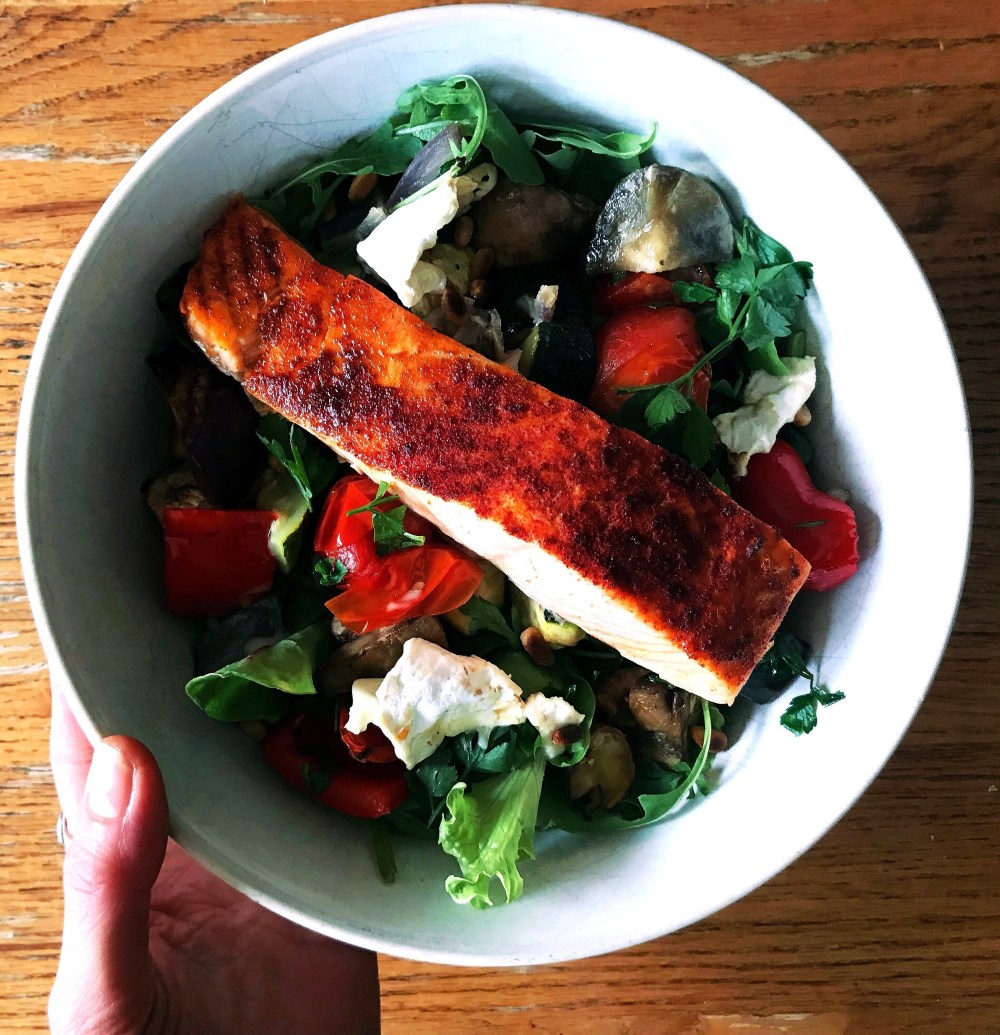 This is one of our midweek staple suppers. Really simple to make, I like it tossed through dark green leaves, whilst my husband prefers to bulk it up with a bowl of spaghetti. You could also use chicken breast instead of salmon (in which case cook the breasts for 25 minutes) or you could omit the salmon altogether and add some chopped avocado and black olives at the last minute for a gorgeous veggie meal.