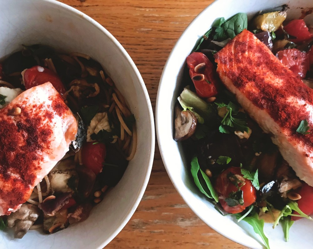 Rub the smoked paprika into the salmon fillets, and put them on a separate roasting tray. Once the veggies have had 20 minutes, give them a good toss around, then put the salmon in the oven too.