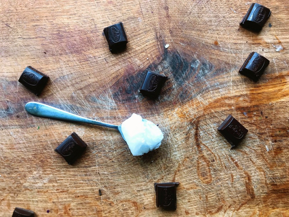 Chop the chocolate into small chunks, and put 150g of it into a microwave proof bowl, along with the coconut oil. Melt them together on a low heat in short blasts in the microwave and then stir well until all the chocolate has melted.