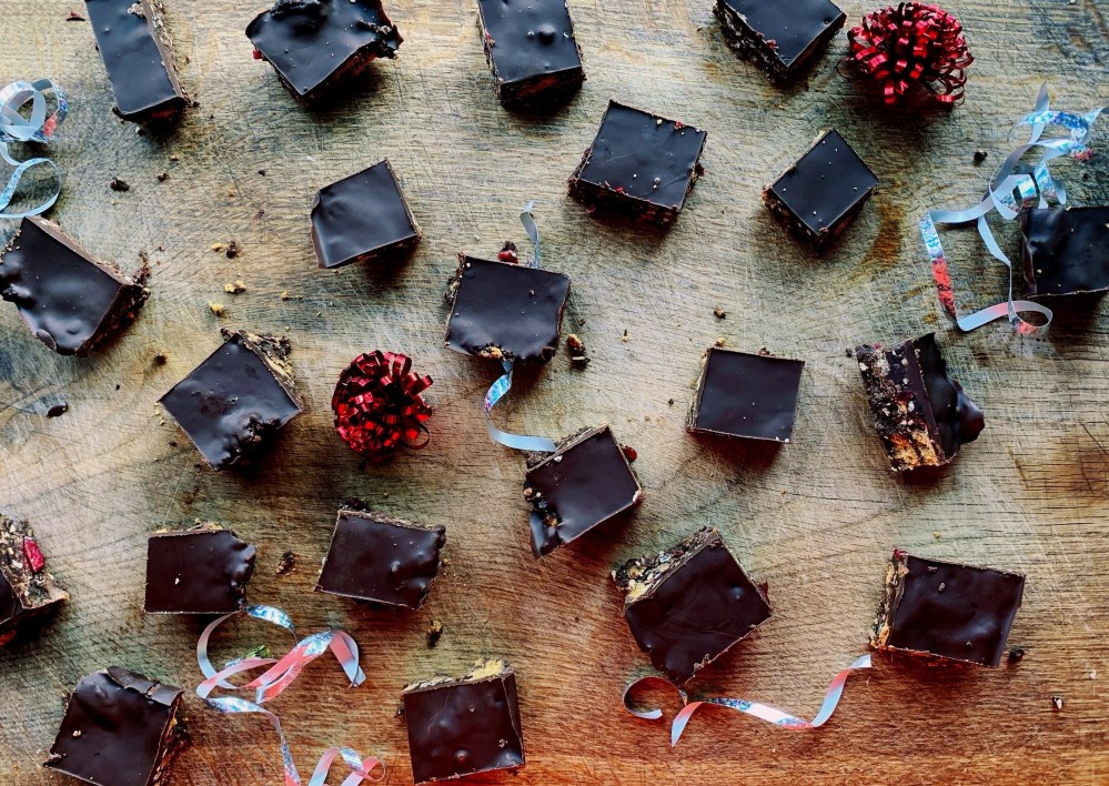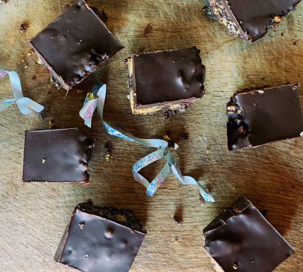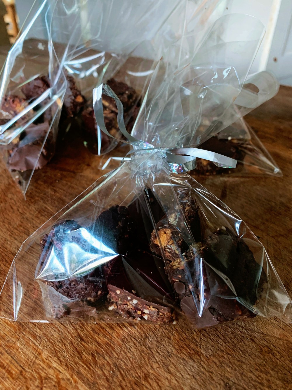 When the chocolate topping has hardened, remove from the pan, cut into bite sized squares and decant into festive bags as a lovely Christmas gift – or just pile up on a plate and dig in!