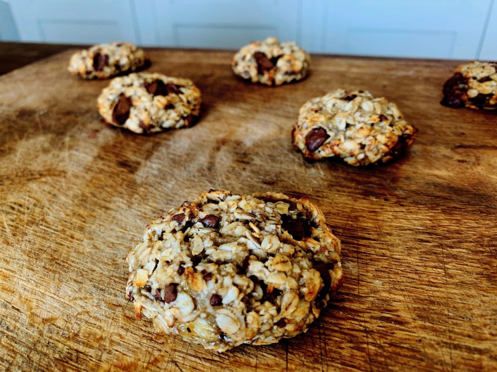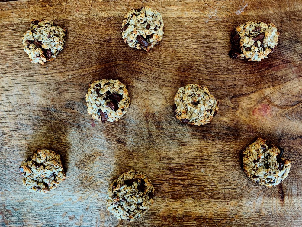 Preheat the oven to 160 and grease a large baking tray. Mash the banana in a bowl, then add the oats, honey or maple syrup and oil or butter, plus a pinch of salt and stir well. Allow the mix to sit for ten minutes, then stir in the chocolate chunks.