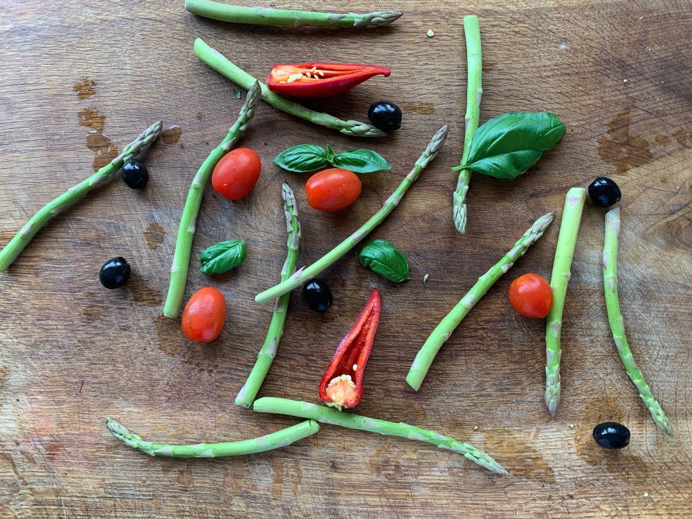 Heat the oven to 180. Put the asparagus into a roasting tray, season and drizzle with olive oil, then roast in the oven for 15 minutes.