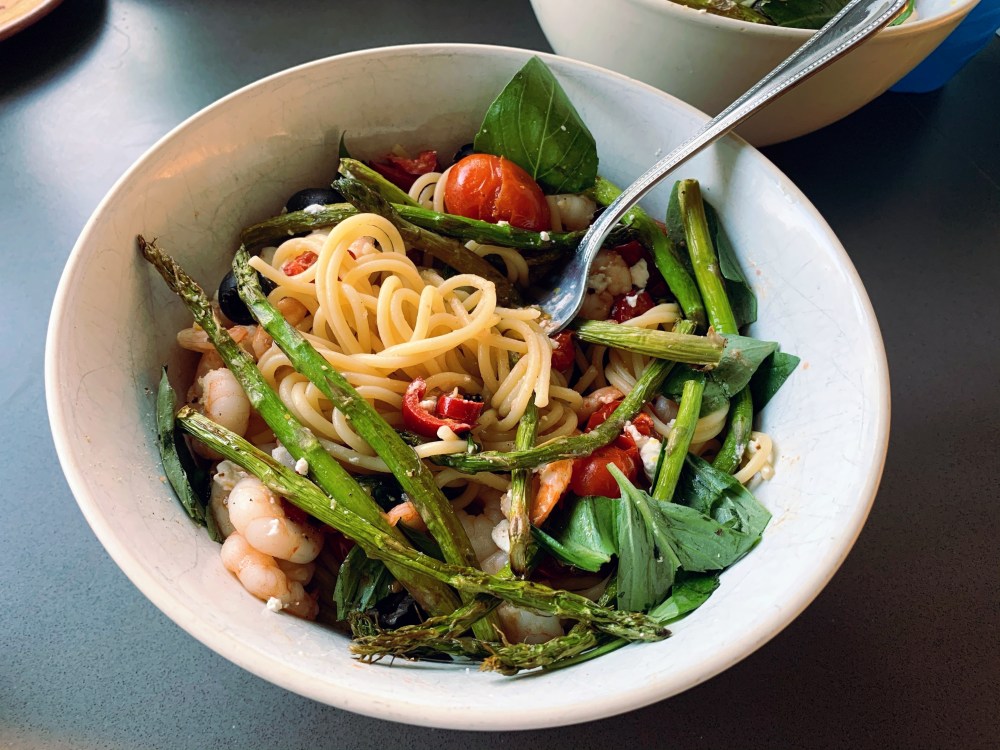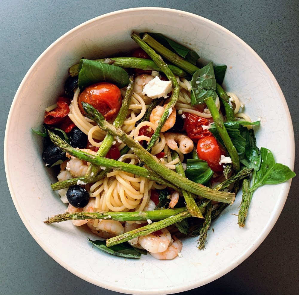 Stir through the garlic chilli prawns, and then top with the roasted asparagus, sprinkle over the chopped feta and serve immediately.