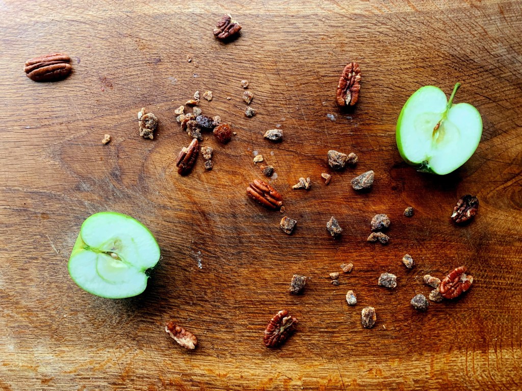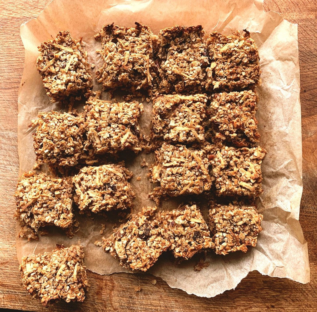 Put the coconut oil or butter, sugar and syrup into a small saucepan and gently heat until the sugar has melted. In a large bowl, mix together the oats, a good pinch of salt and the spices. Put the pecans into a small food processor and whizz briefly until finely chopped. Add them to the bowl, along with the chopped dates. Peel the apple, then grate it into the bowl. Pour over the melted oil and sugar, and give it all a good mix before transferring to the baking tin.