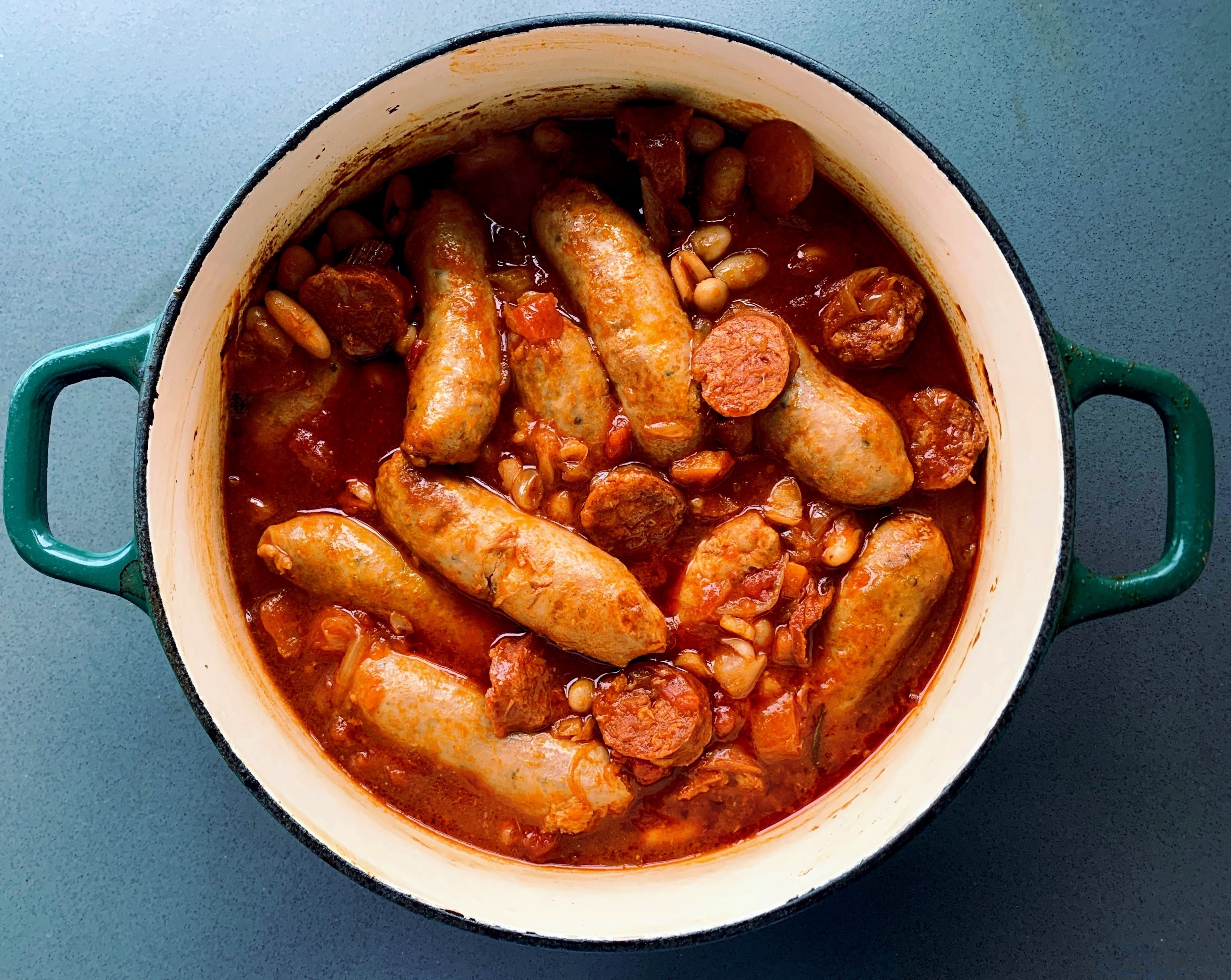 Preheat the oven to 140. Put a large casserole dish on the hob on a medium heat and add good glug of olive olive. Add the sausages to the pan and gently fry until browned all over, then remove the sausages from the pan to a plate, and drain most of the fat from the pan.