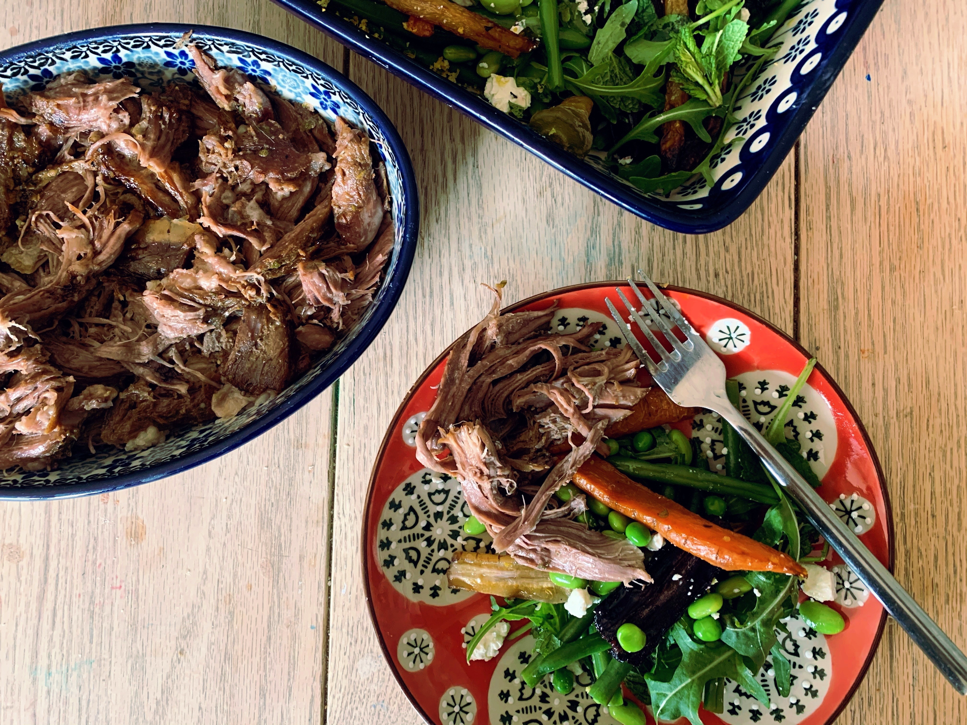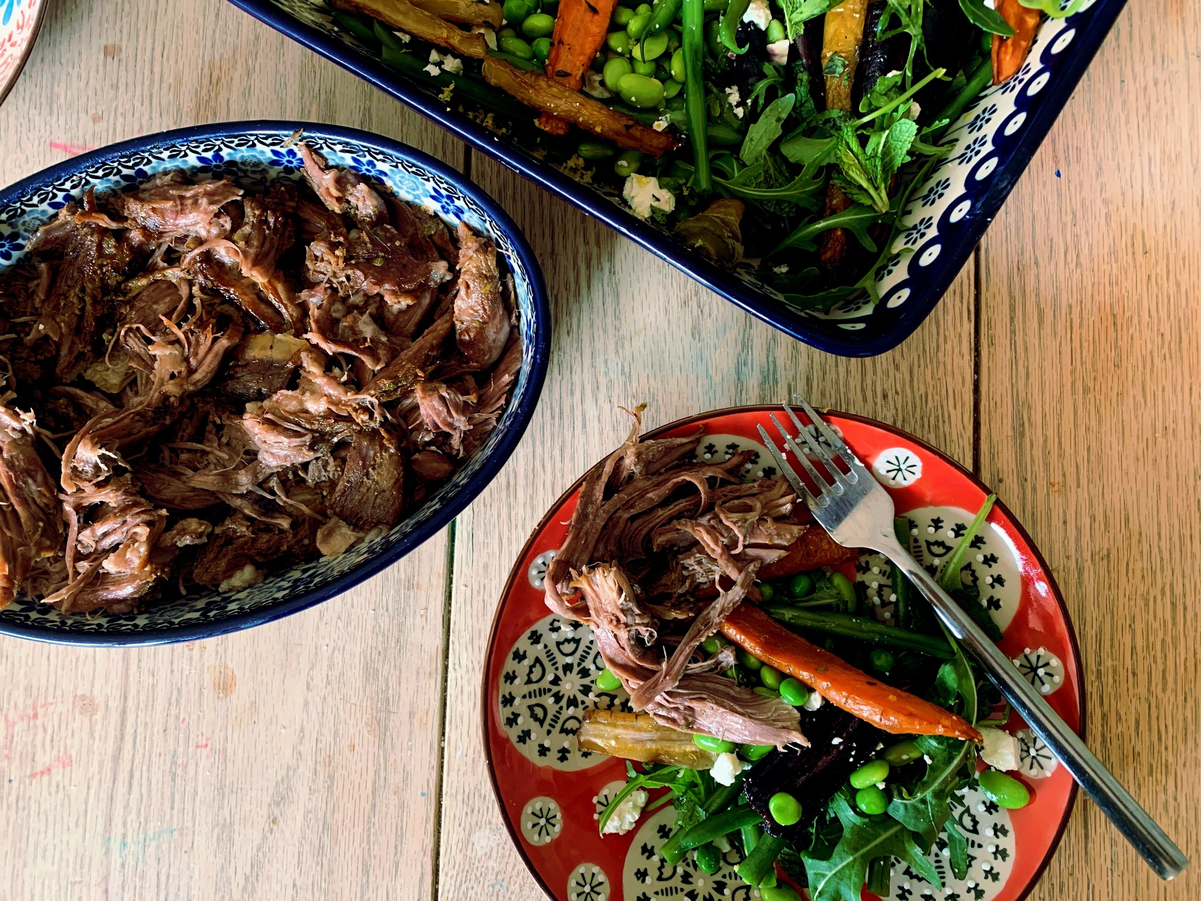 Shred the lamb from the bone and pile it into a serving dish.