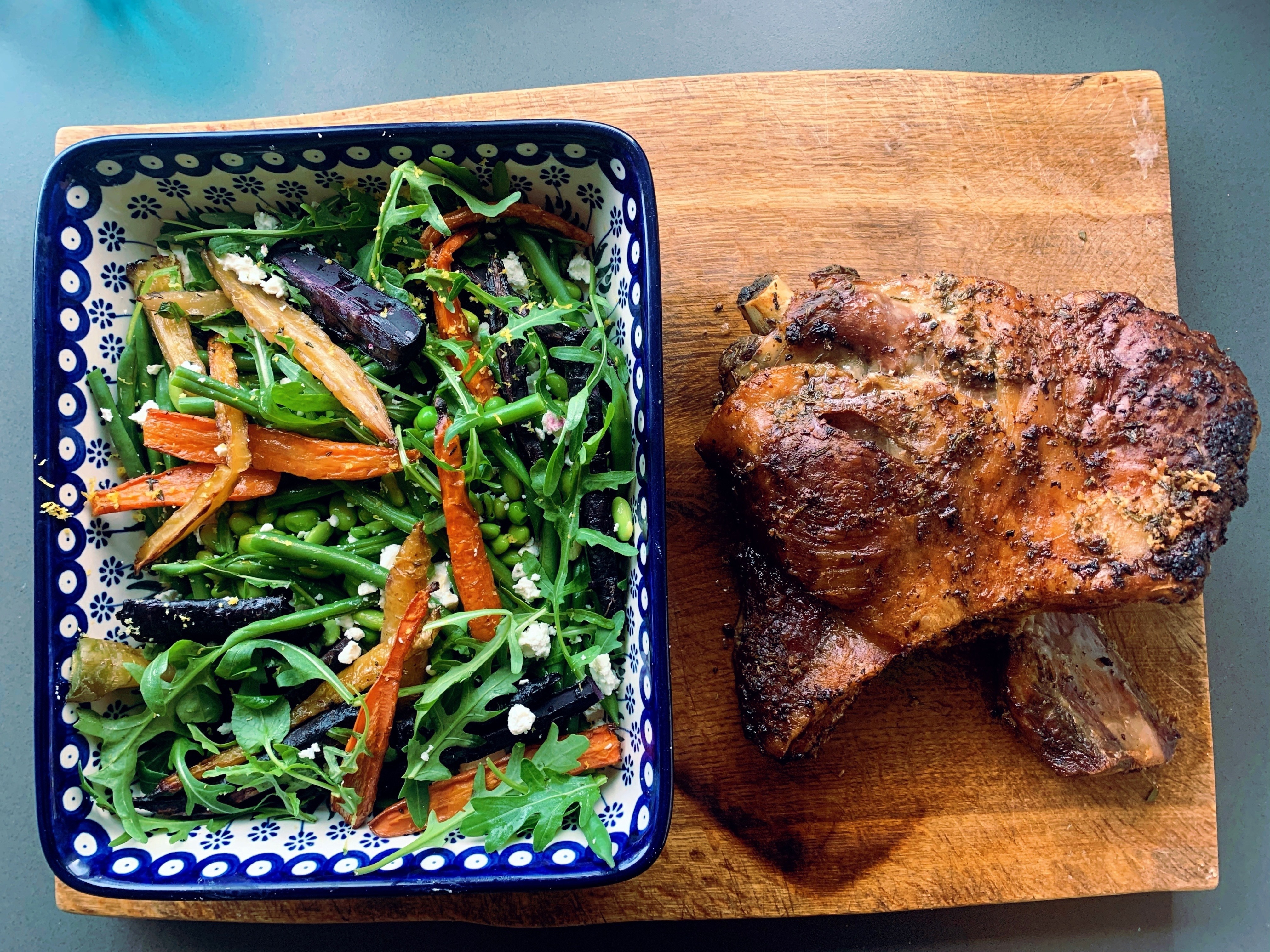 After the lamb has cooked slow and low for 4 hours, take it out of the oven, remove the foil and baste again. Whack the oven heat up to 180, put the lamb back in on the bottom shelf, uncovered, and put the carrots in to roast on the top shelf. Give it all 25 minutes, then remove it from the oven to rest.