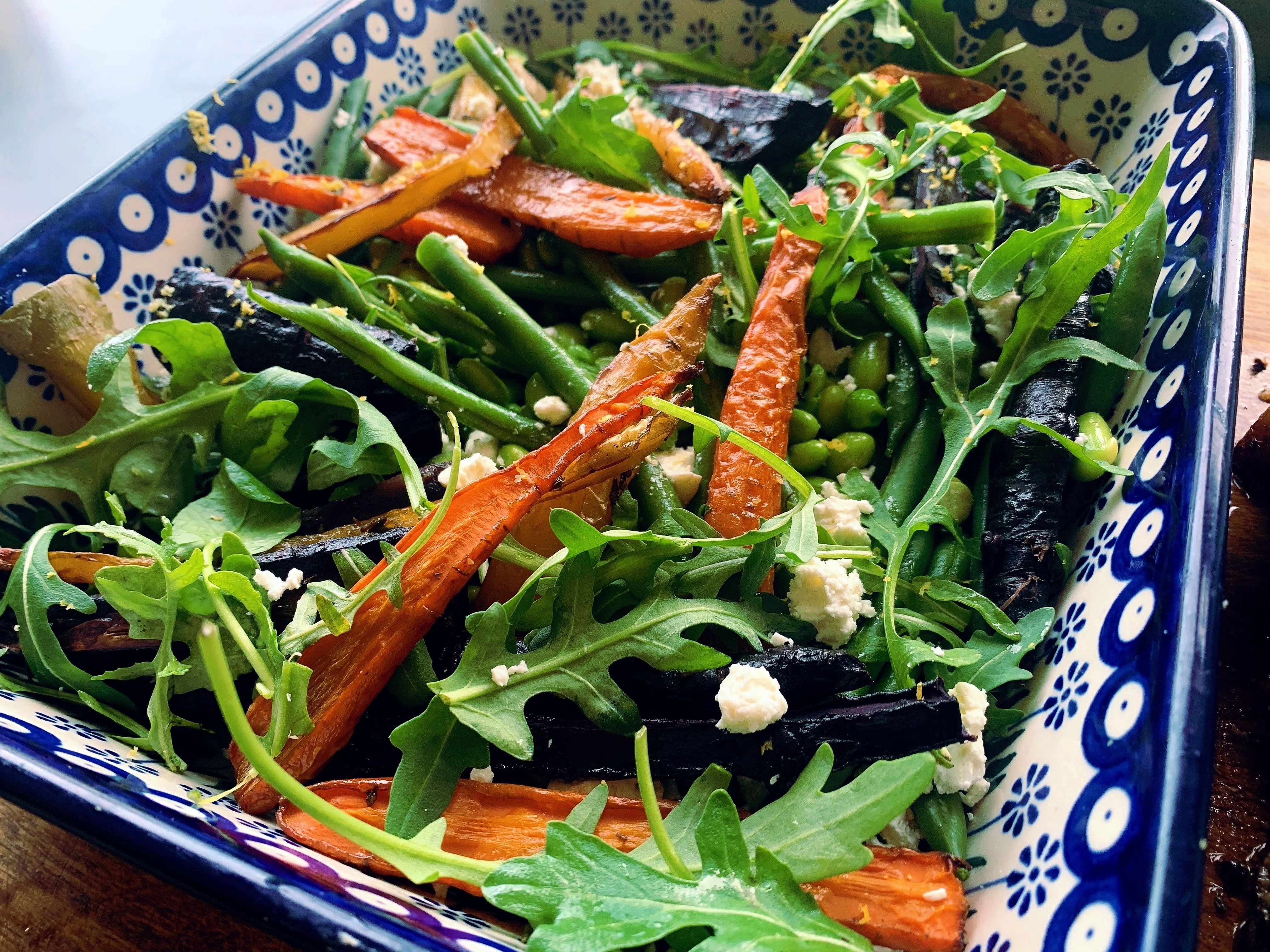 Drain the green veg and put it all into a large serving dish along with the carrots. Zest over the lemon and add the chopped feta. Juice the lemon into a small dish, add a glug or two of olive oil and mix with a good pinch of salt and plenty of black pepper.