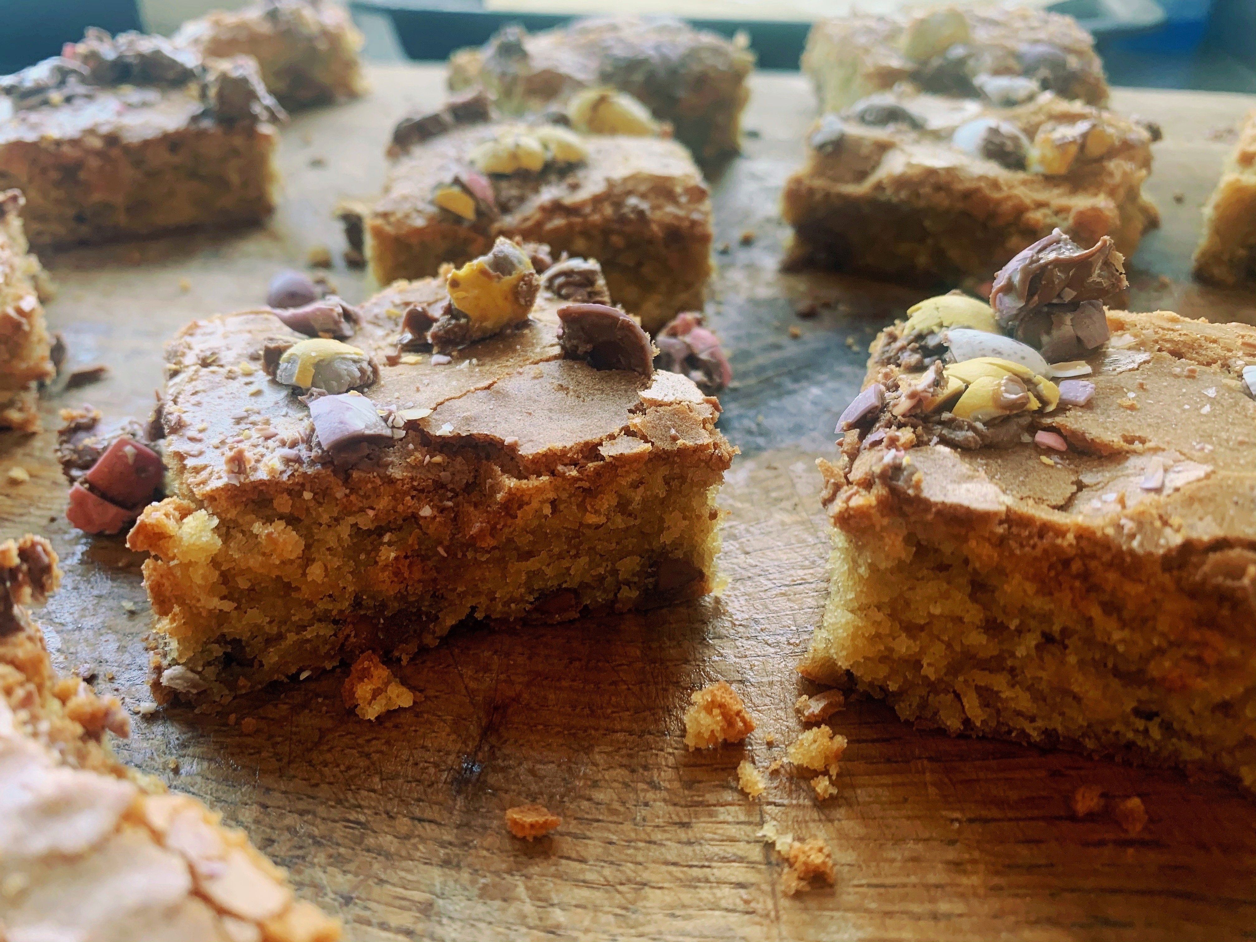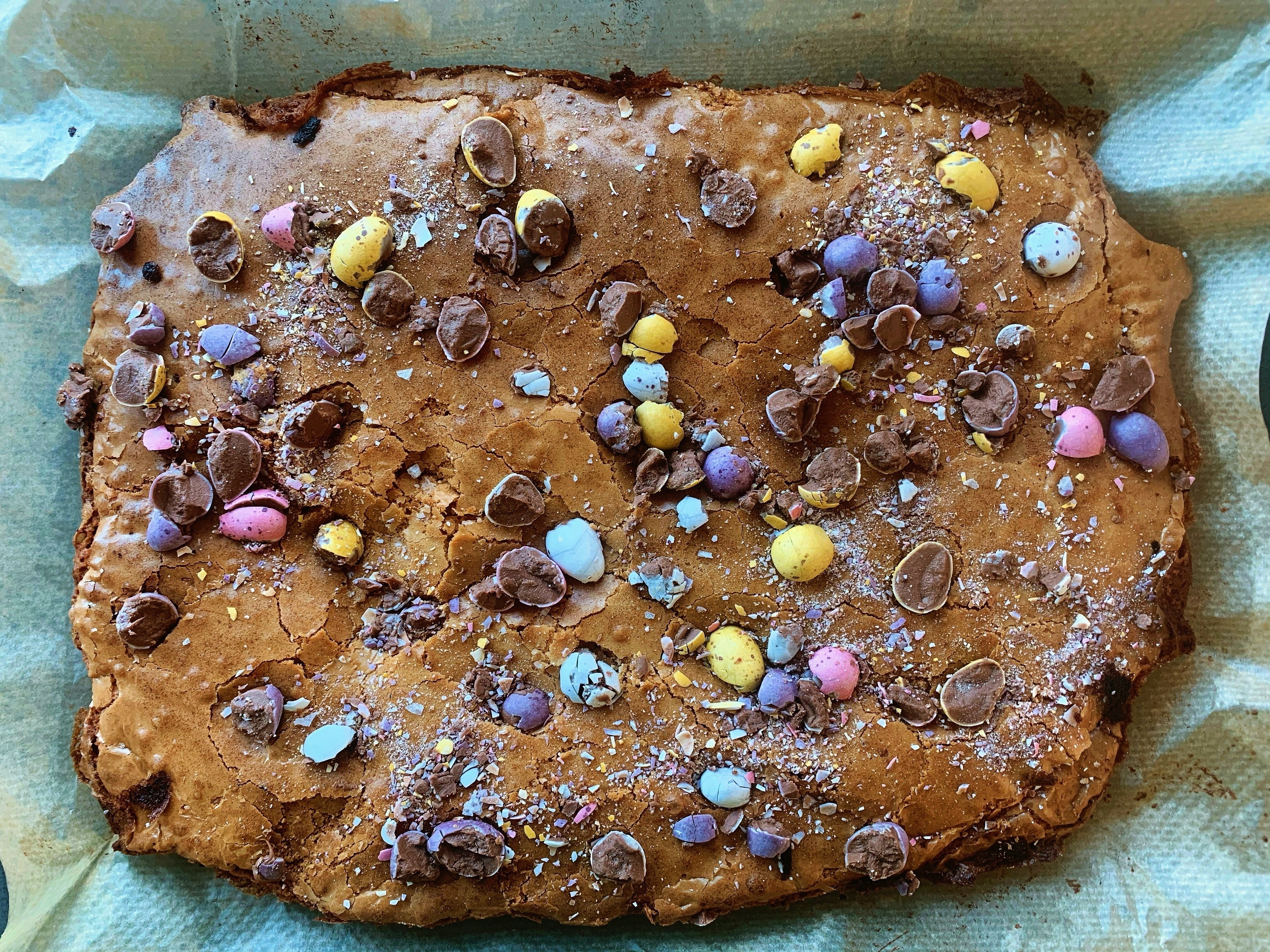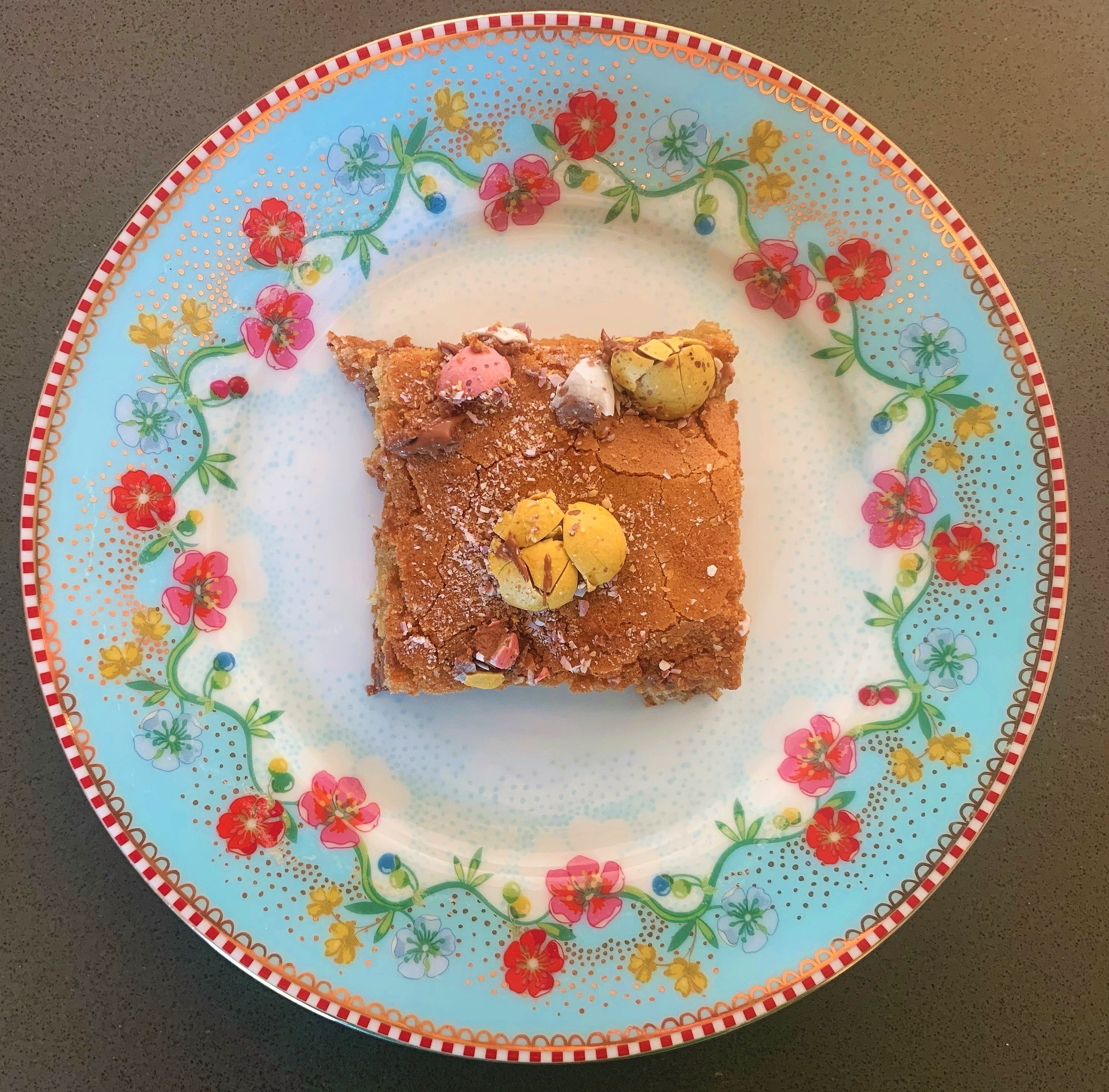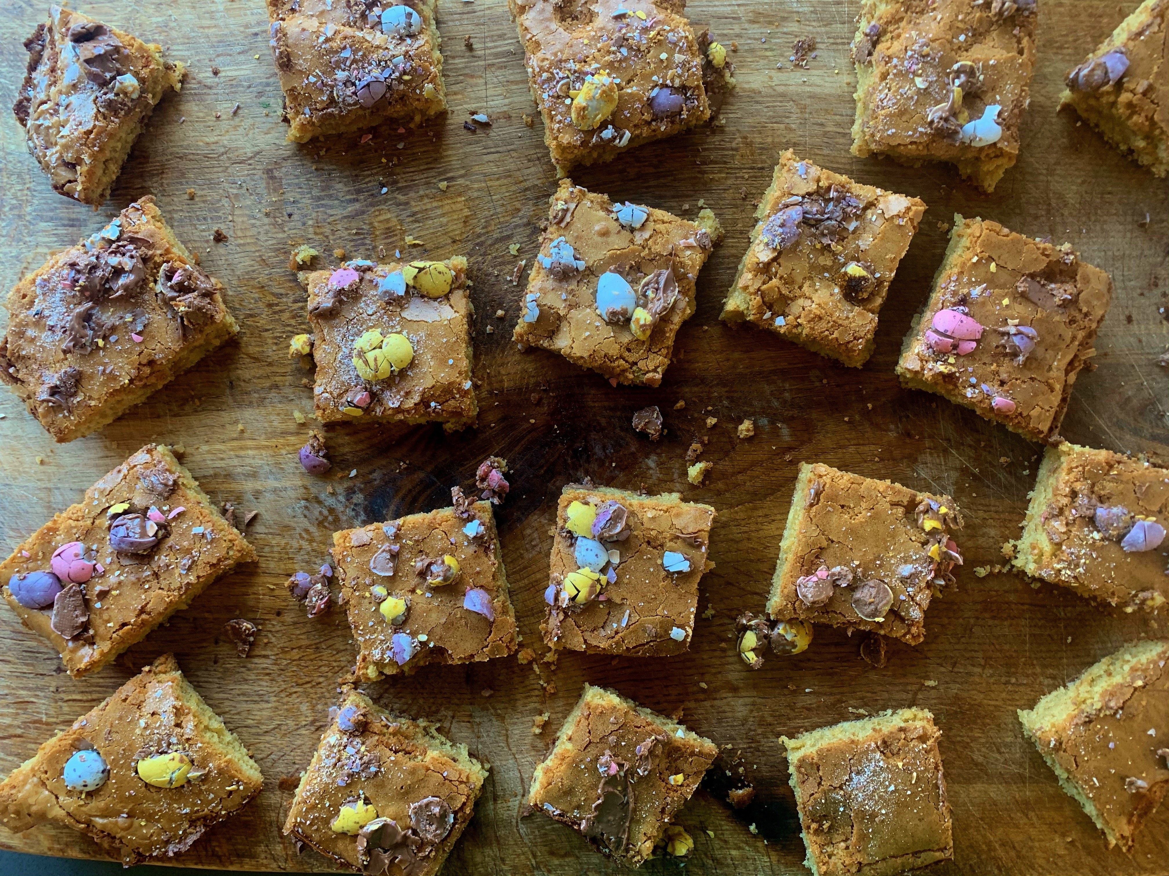 Remove the blondie from the oven, and allow to cool in the pan for 5 minutes, while you roughly chop or bash the remaining bag of mini eggs. (Again, it’s well worth eating one, just to check again that this bag is ok.)