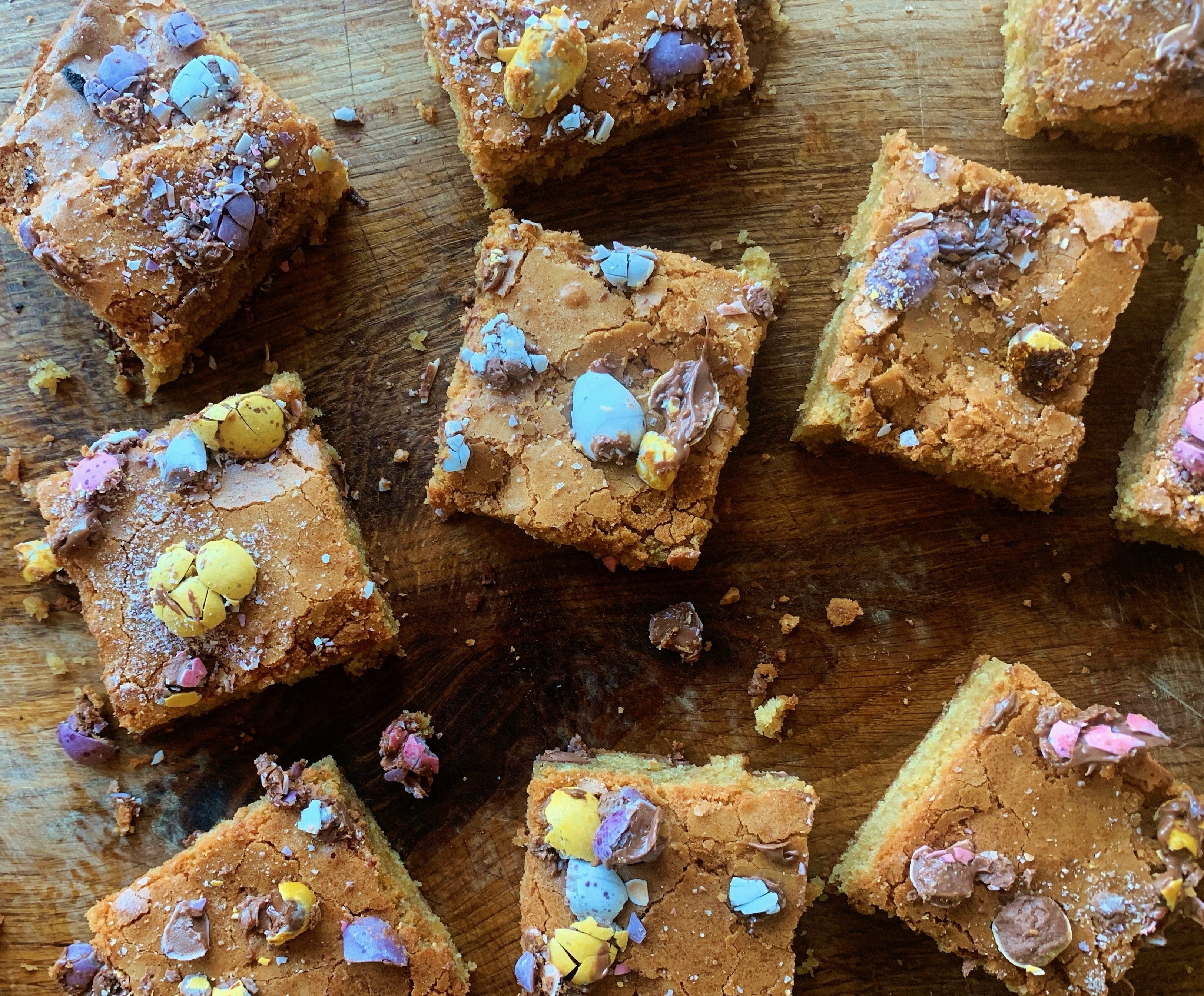Scatter the mini eggs over the cooling blondie, along with one more tiny pinch of sea salt, and gently press it all into the cake a little with the back of a spoon.