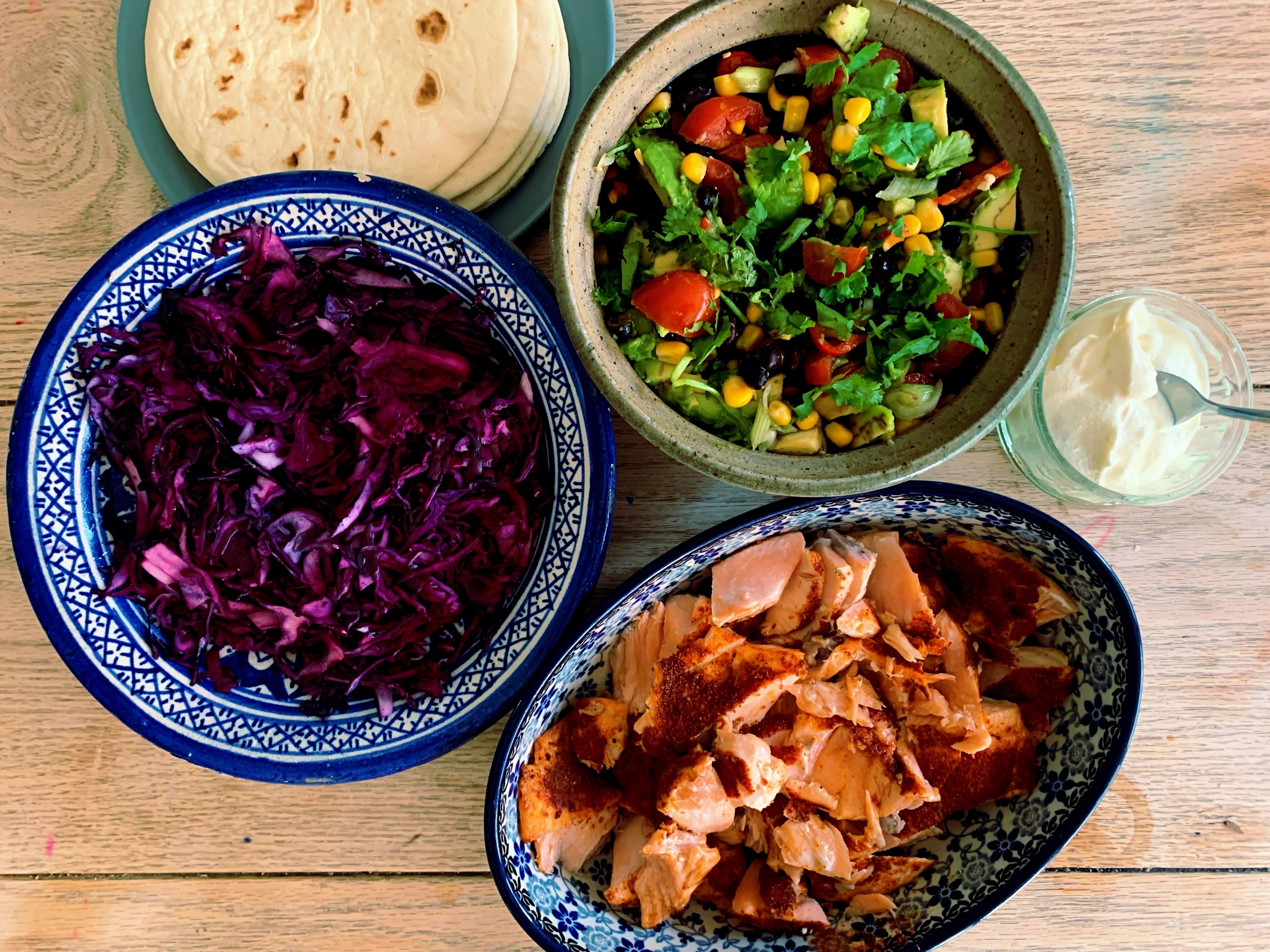 Bring the salmon, salads, tacos and sour cream to the table, and dig in.
