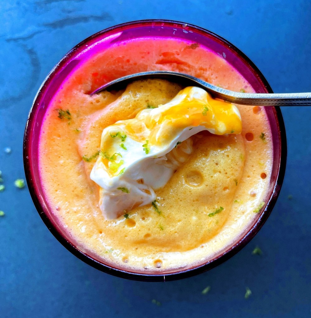 Gently fold the zesty lime cream and mango pulp or puree in to the egg and sugar mix.